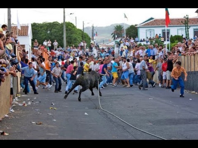 ###Walka z bykami (w tym czasie to tylko te ortograficzne nam zostana ale cusz....Na małej wysepce Terceira, leżącej w archipelagu Azorów, co roku w okresie od maja do września odbywają się uliczne gonitwy byków, do złudzenia przypominające te w hiszpańskiej Pampelunie. Założenia całej zabawy są podobne: wypuszcza się rozdrażnione byki na zagrodzone ulice miasta, gdzie uliczni toreadorzy zachęcają je do szarży. Byka atakuje, ludzie uciekają, a wszystko to dzieje się ku uciesze setki gapiów. Na Azorach jednak ów „sport” nieco zmodyfikowano, aby była bardziej humanitarny zarówno dla zwierząt, jak i dla ludzi. A wygląda to tak… Na zagrodzone ulice miasta po kolei wypuszcza się 4 byki, a każdy z nich ma na szyi uwiązaną linę, którą trzyma ośmiu mężczyzn zwanych pastores. Uliczni toreadorzy (capinhas) drażnią byki i zachęcają do szarży. Oczywiście robią to w całkowicie bezkrwawy sposób, za pomocą kolorowych płacht, parasolek czy kurtek. Rozłoszczone byki zaczynają gonitwę i atak na ludzi. Starcie z nimi jest mniej bolesne niż z tymi w Pampelunie. Azorskie byki bowiem mają rogi zabezpieczone mosiężnymi kulkami, a wspomnianych wcześniej ośmiu mężczyzn pilnuje, aby zwierzę nie rozhulało się za bardzo. Gdy byk jest zbyt agresywny pastores uwieszają się na linie, aby go powstrzymać. Po gonitwie byki zaganiane są do klatek. Zwierzęta nie są zabijane, tu panuje inna zasadza – im bardziej hardy był byk tym chętniej ludzie biorą udział w imprezie w następnym roku, oczywiście z tymże bykiem w roli głównej. Cała impreza znana jest pod nazwą tourada á corda, czyli walka z bykiem na sznurze. Co roku na Terceirze odbywa się 250 takich gonitw. Cyklicznie organizują je miasteczka, wioski bądź nawet pojedyncze ulice. Zatem prawdopodobieństwo trafienia na taką imprezę jest spore.